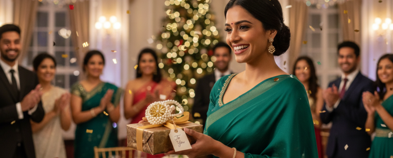 Ditch the standard neutrals for a bold, jewel-toned theme. A rich emerald green saree or gown creates an instant focal point of grace and authority. Complement these deep tones with gold accents in your decor—think gold-trimmed dinnerware, warm chandeliers, and gilded gift wrapping—to create a space that feels both regal and inviting.