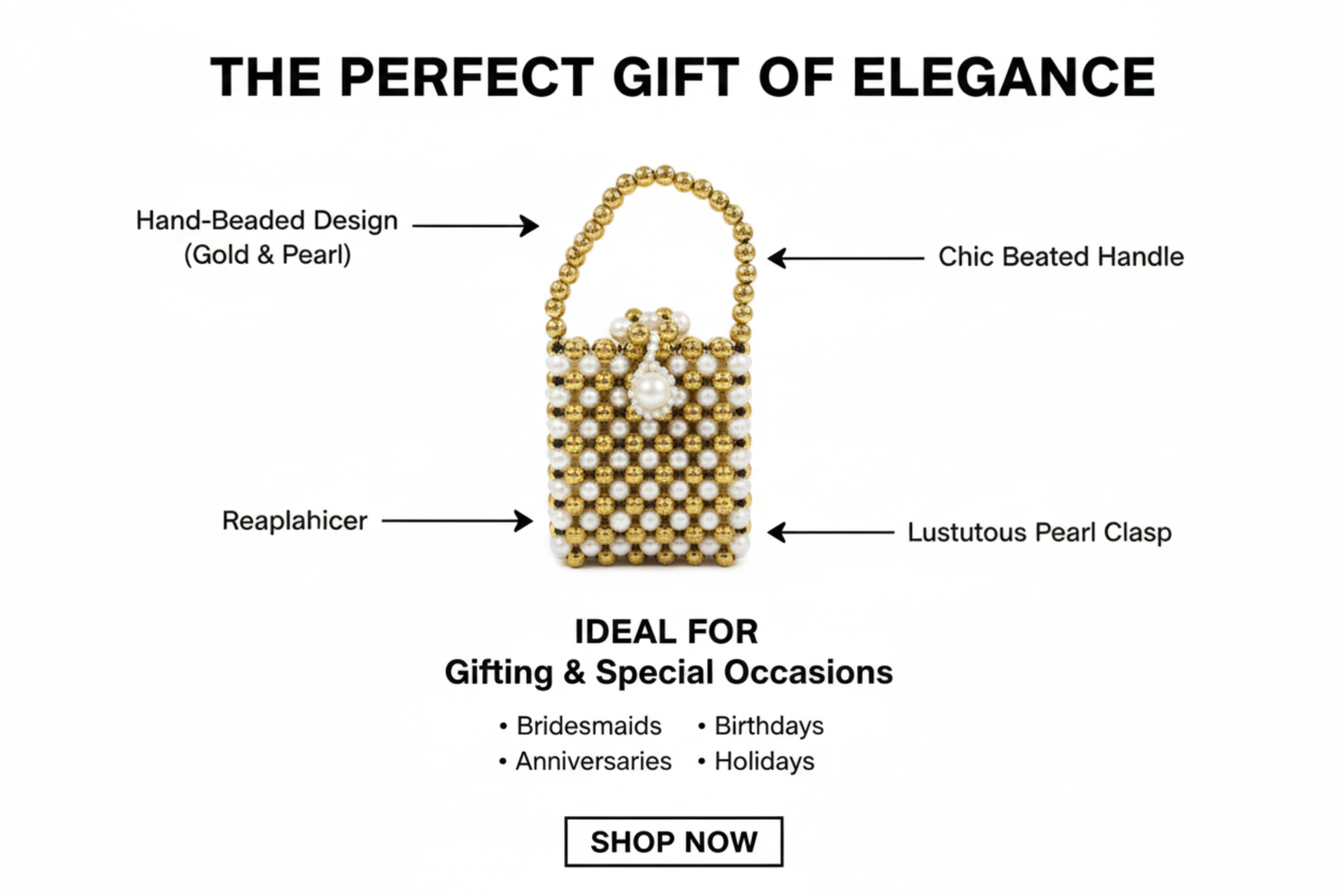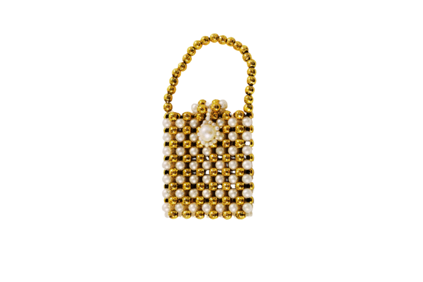 Add a touch of timeless elegance to your ensemble with our handcrafted gold and pearl mini bag. Featuring a lustrous pearl clasp and a chic beaded top handle, this intricate accessory is the perfect gift for bridesmaids or special celebrations.
