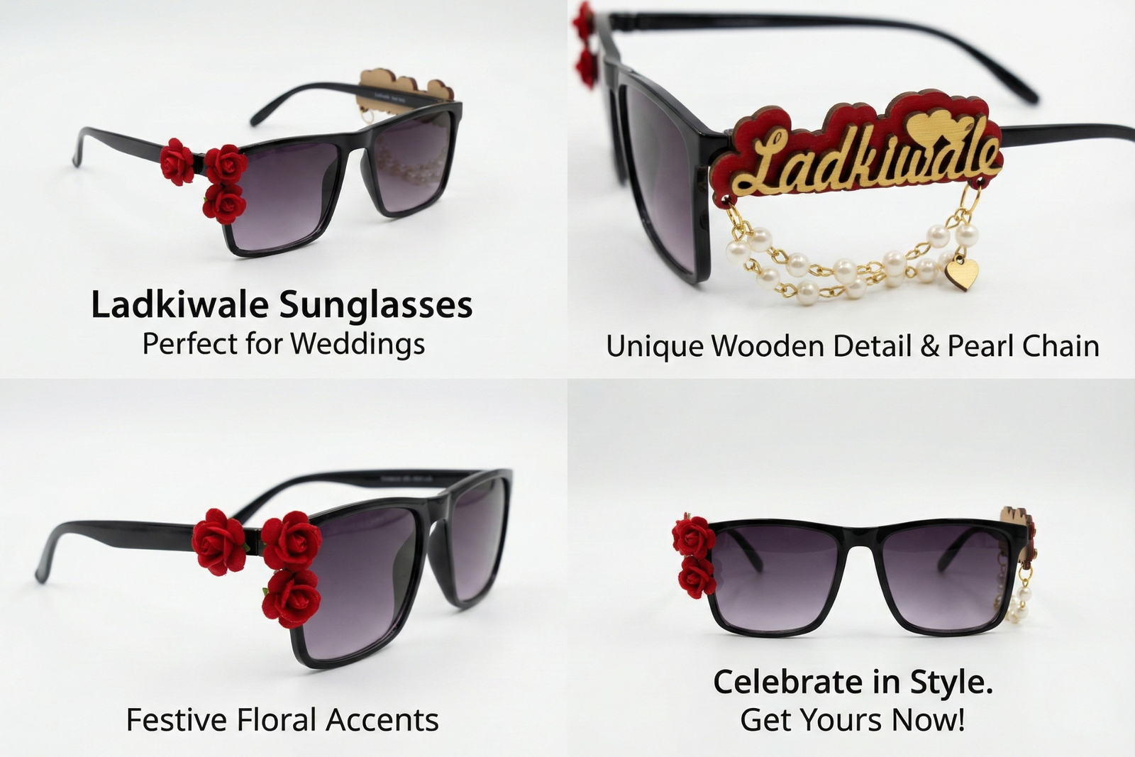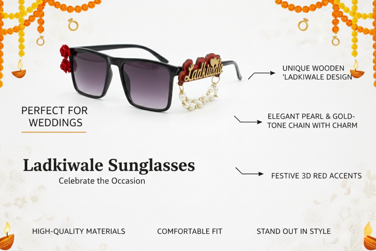 Make a grand entrance with our exclusive “Ladkiwale” sunglasses. Featuring handcrafted red floral accents and a unique wooden “Ladkiwale” cutout with a delicate double-layered pearl chain, these shades are the ultimate accessory for the bride’s tribe to celebrate in style.